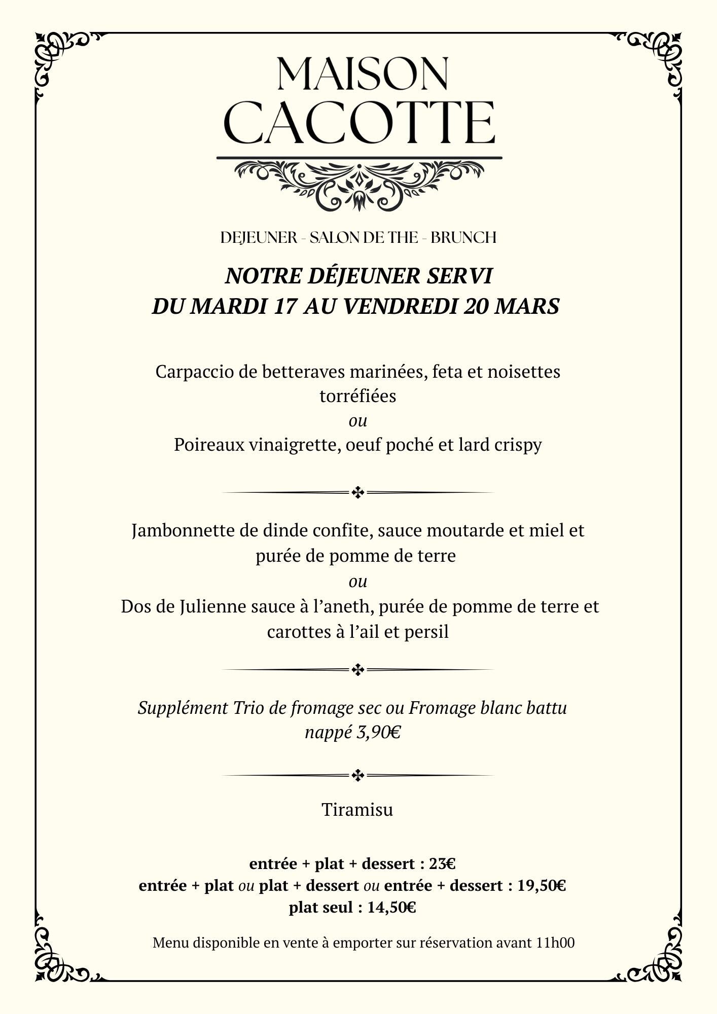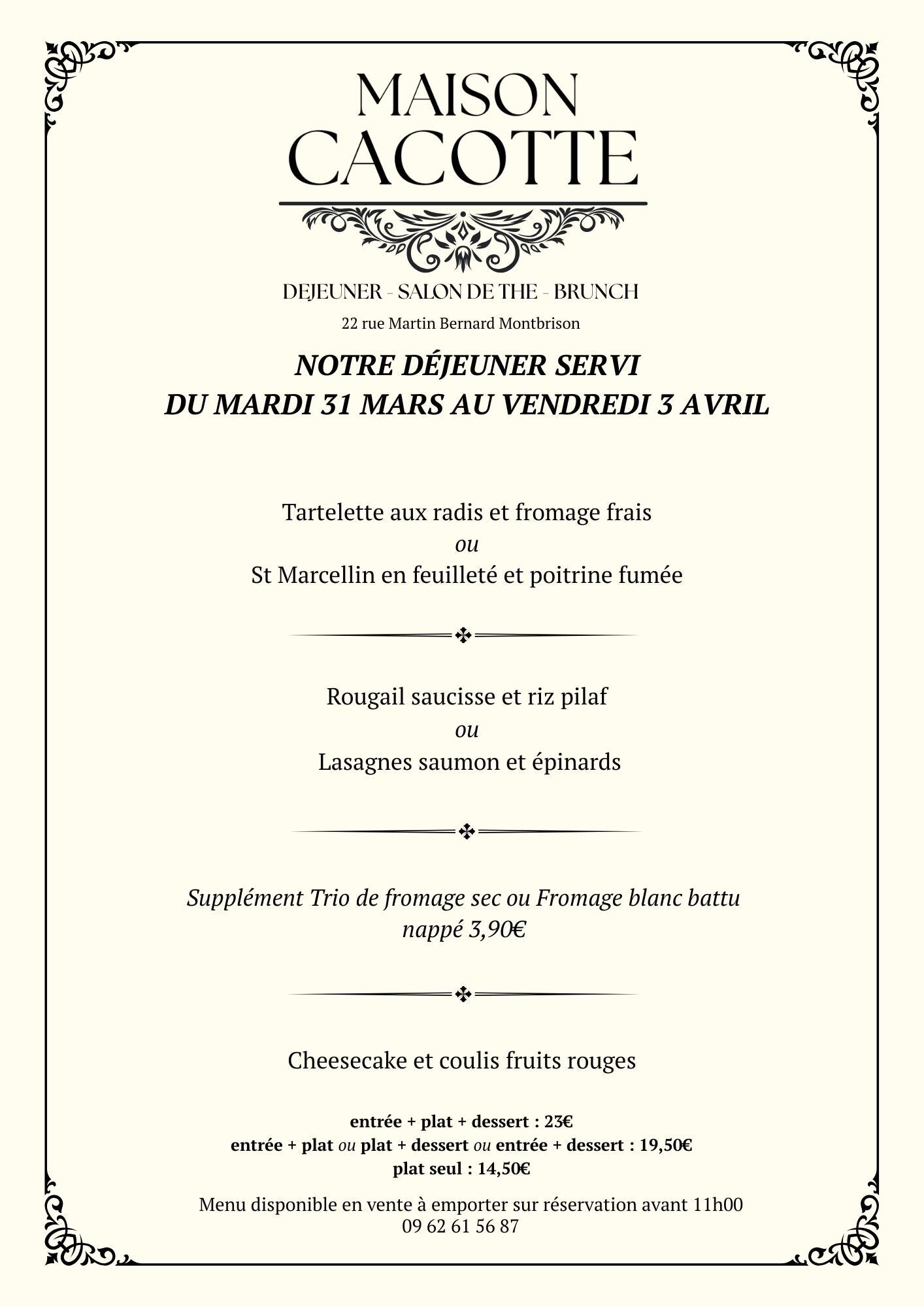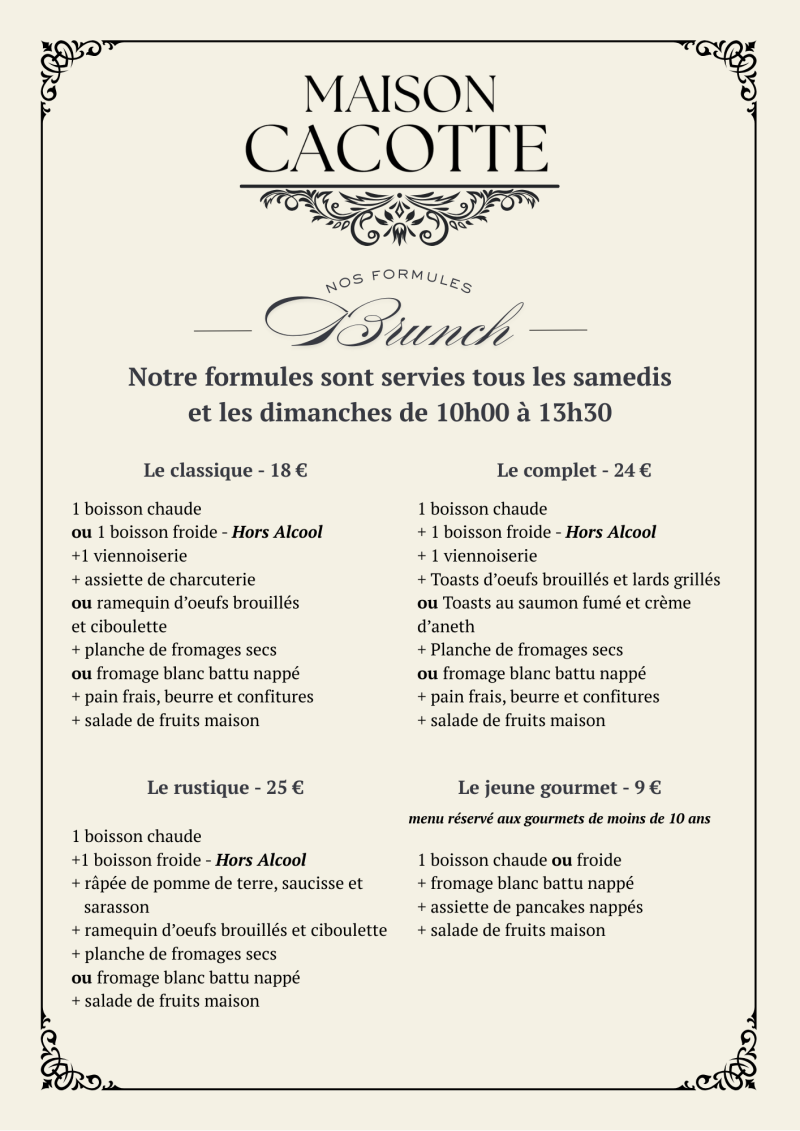 Chaque week-end, c'est Brunch chez Maison Cacotte ! Retrouvez nos menus brunch les Samedi et Dimanche uniquement. Nos menus et nos plats à la carte vous permettront de décompresser de la semaine et de passer un bon moment en famille ou entre amis. Sur réservation, nous pouvons décliner nos formules à emporter.